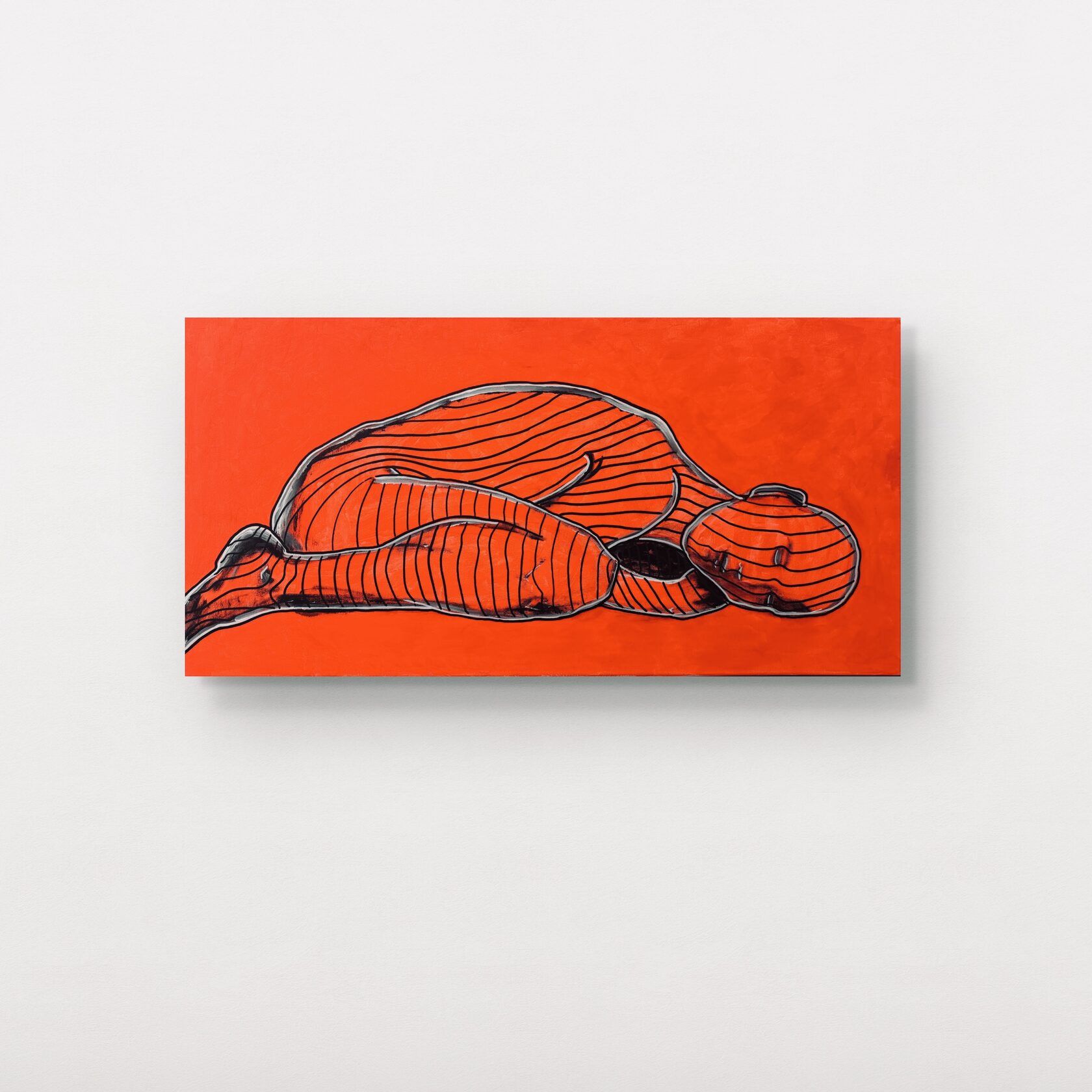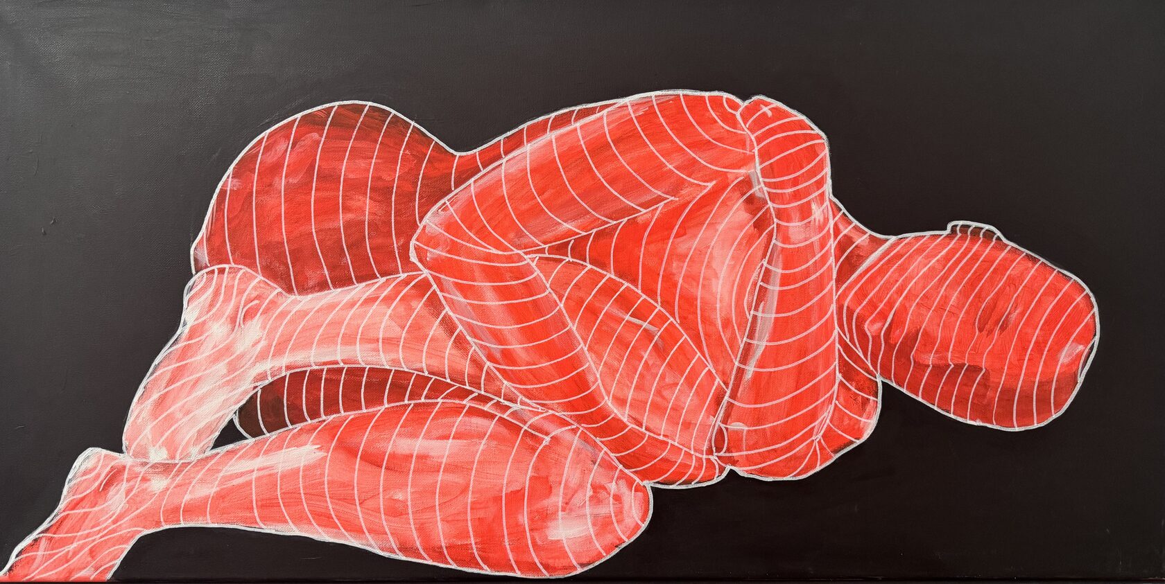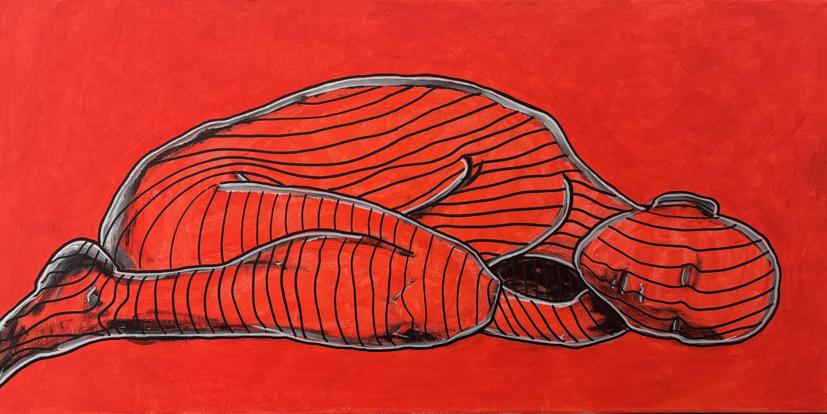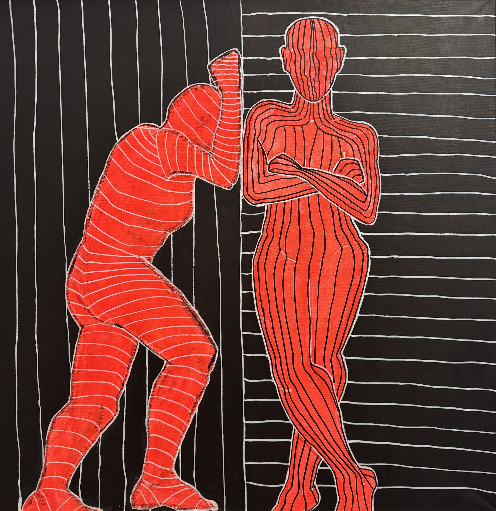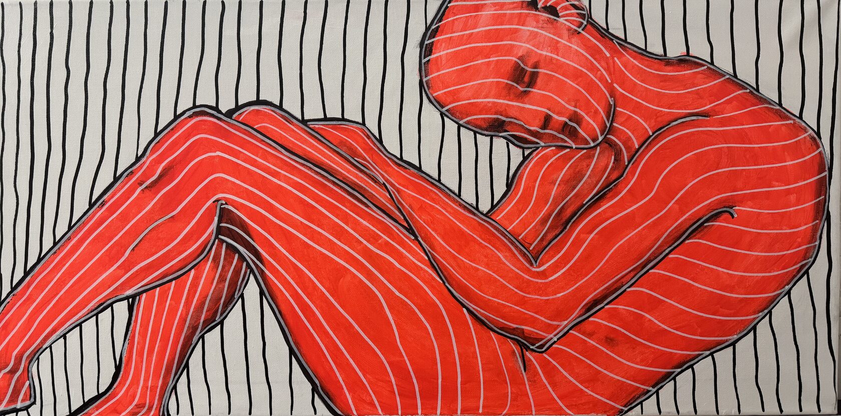 чёрные полосы, которые в первой работе были внешним ограничением, теперь проникли внутрь — они на теле, они стали частью. это стадия глубокого проживания травмы, когда внешнее уже не давит, потому что давление стало внутренним